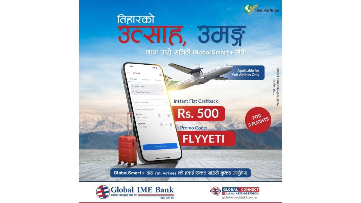 ग्लोबल आइएमई बैंकका ग्राहकहरुका लागि यती एयरलाइन्सको टिकट खरिदमा निश्चित क्यासब्याक अफर योजना सार्वजनिक भएको छ ।