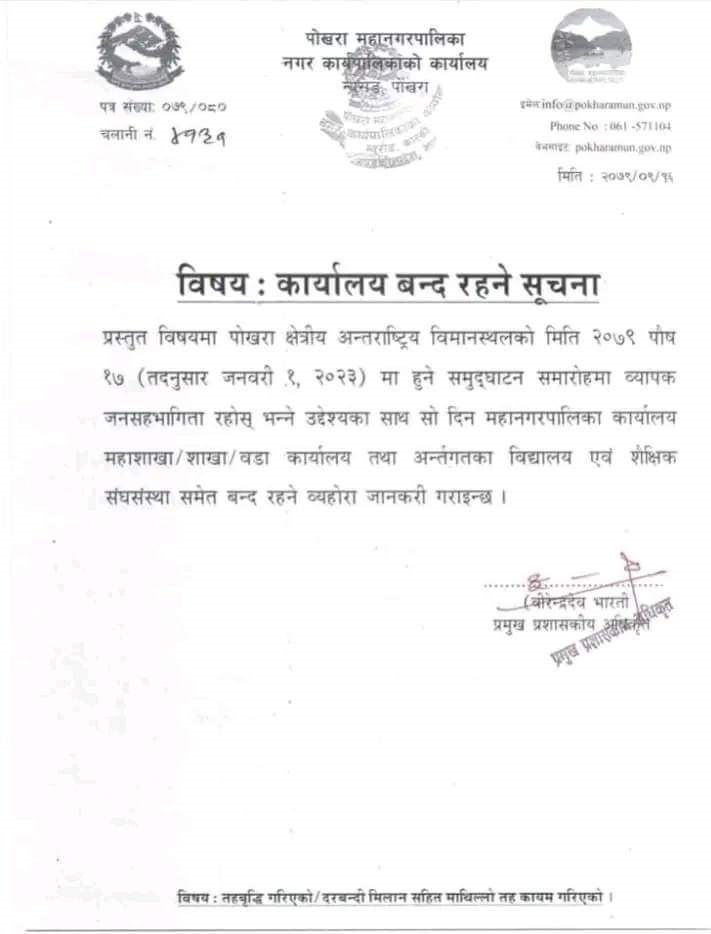 महानगरले शनिबार एक सूचना प्रकाशित गर्दै बिमानस्थल उद्घाटनका दिन पोखरा महानगरपालिका कार्यालय, महाशाखा, शाखा, वडा कार्यालय तथा यस अन्तरगत महानगरपालिका भित्रका विद्यालय एवं शैक्षिक संस्था बन्द गर्ने निर्णय गरेको जनाइएको छ । पोखरामा क्षेत्रीय अन्तर्राष्ट्रिय विमानस्थल संचालनसँगै विदेशी पर्यटकको आगमन वढ्ने आशा गरिएको छ ।