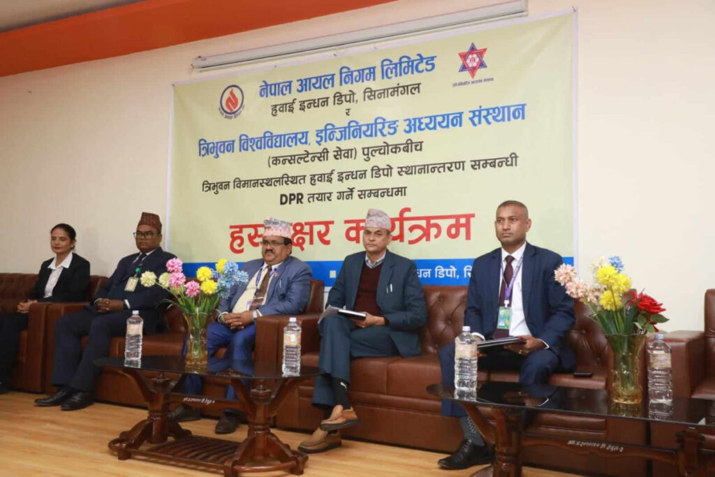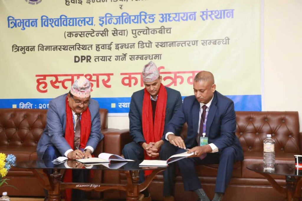 बुधबार एक कार्यक्रमका बिच हवाई इन्धन डिपो सिनामंगलले त्रिवि इन्जिनियरिङ संस्थान पुल्चोकलाई इन्धन डिपो स्थानान्तरण सम्बन्धी डिपिआर तयार गर्न सम्झौता गरेको छ । सम्झौतापत्रमा हवाई इन्धन डिपो सिनामंगलका प्रमुख इन्जिनियर प्रदीपकुमार यादव र पुल्चोक इन्जिनियरिङ क्याम्पस कन्सलटेन्सी सेवा विभागका सहप्राध्यापक नारायणप्रसाद गौतमले हस्ताक्षर गरेका छन् ।