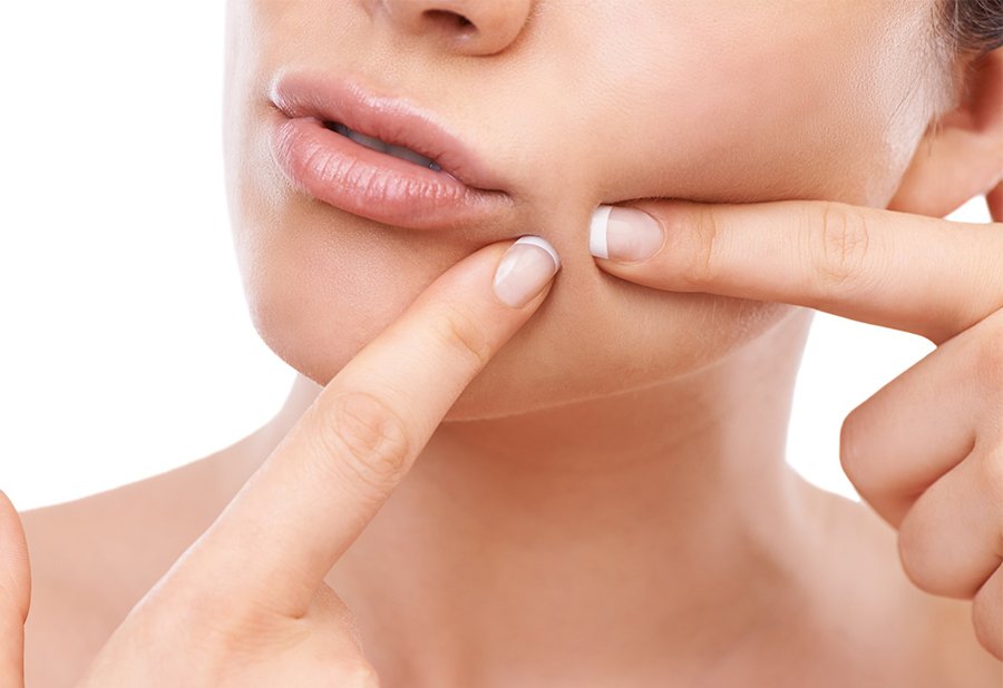 A cropped image of a woman squeezing a pimple