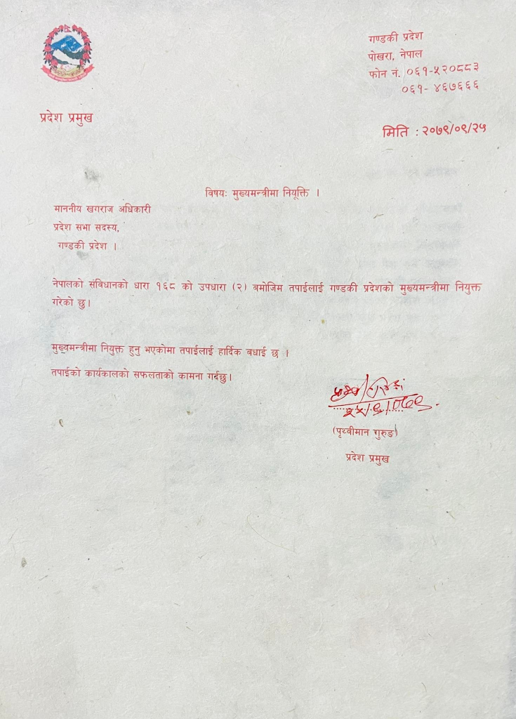 पोखरा । गण्डकी प्रदेशको मुख्यमन्त्रीमा खगराज अधिकारी नियुक्त भएका छन् । प्रदेश प्रमुख पृथ्वीमान गुरुङले ३३ सांसदको समर्थन प्राप्त एमालेका संसदीय दलका नेता अधिकारीलाई संविधानको धारा १६८९२० बमोजिम मुख्यमन्त्री नियुक्त गरेका हुन् ।