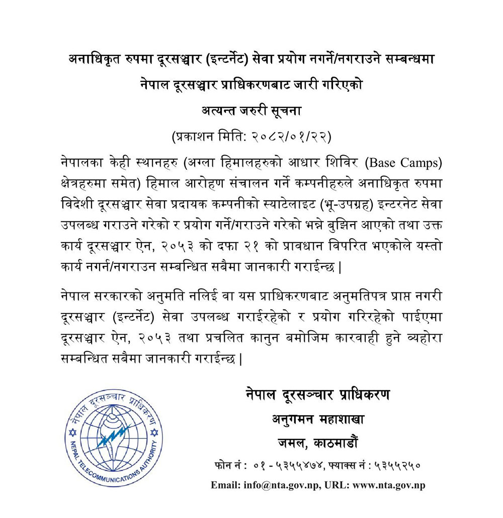 हिमाली क्षेत्रमा खासगरी अग्ला हिमालको आधार शिविर क्षेत्रमा एलन मस्कको कम्पनि स्टार लिंकको स्याटेलाइट इन्टरनेट संचालन भएको पाइएपछि प्राधिकरणले सूचना निकालेर तत्काल रोक्न निर्देशन दिएको हो ।