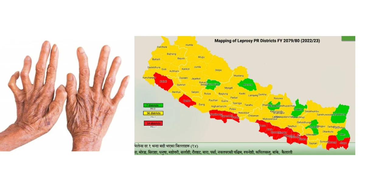 तर जिल्ला तहको प्रकोप दर हेर्दा ७७ जिल्लामध्ये १८ जिल्लामा १ भन्दा माथि, ४८ जिल्लामा १ भन्दा कम, ११ जिल्लामा कुष्ठरोगका कुनैपनि नयाँ बिरामी फेला परेका छैनन् । मधेस, लुम्बिनी र कोशी प्रदेशमा क्रमशः रोगको उच्च भार रहेको छ ।