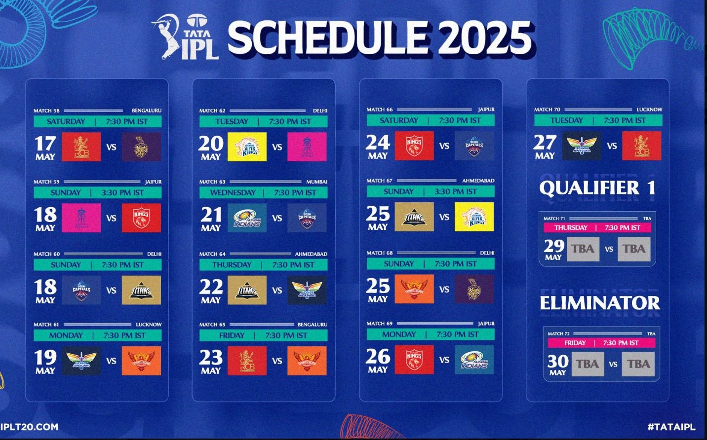 भारत र पाकिस्तानका बिचमा तनाव ब्यवस्थापन भइ युद्द बिराम भए पछि पुन आइपीएल खेल सुरू हुन लागेको हो ।पञ्जाब र दिल्ली बिच जारी भइरहेको खेल स्थगित गरे पछि अन्यौल छाएको थियो । आजको पहिलो खेल अर्थात ५८ म्याच बैंग्लरू र कलकताका बिचमा साँझ ७ः३० बजेवाट सुरू हुनेछ ।