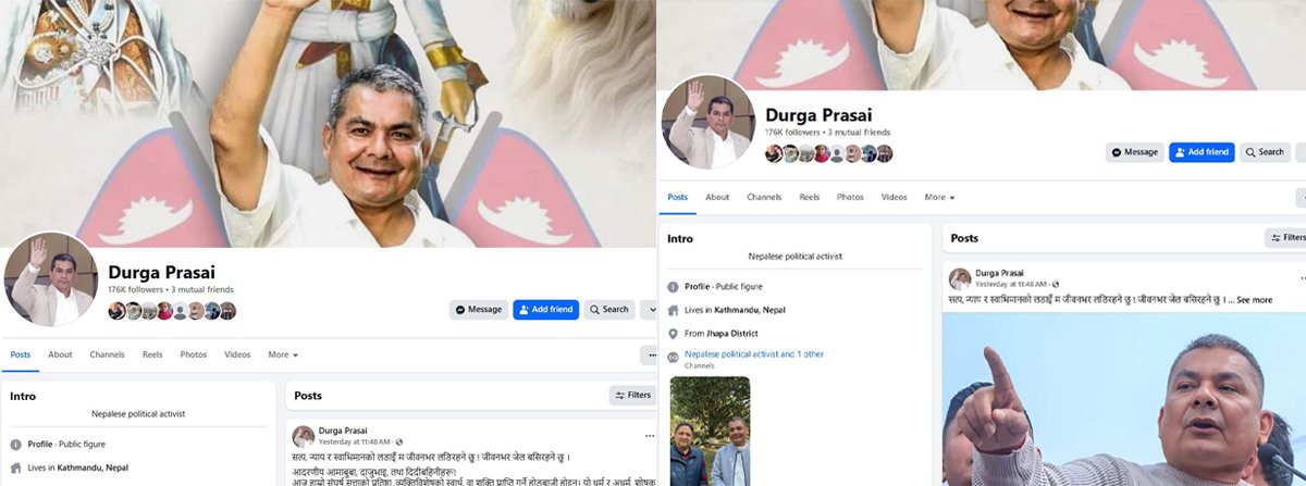 फेसबुकको विवरणअनुसार, ‘दुर्गा प्रसाईं महाअभियान संस्थापक सचिवालय’ नामको फेसबुक पेज १५ भदौ २०८० मा खोलिएको हो । उनको फेसबुक पेज नेपालबाट एक जनाले मात्र चलाउँछन् । त्यसैगरी दुर्गा प्रसाईं नामको फेसबुक आईडी १५ भदौं २०८० मा बनाइएको देखिन्छ र यो फेसबुक पनि नेपालबाट एकजनाले चलाउने गरेको फेसबुकको विवरणमा देखिन्छ ।