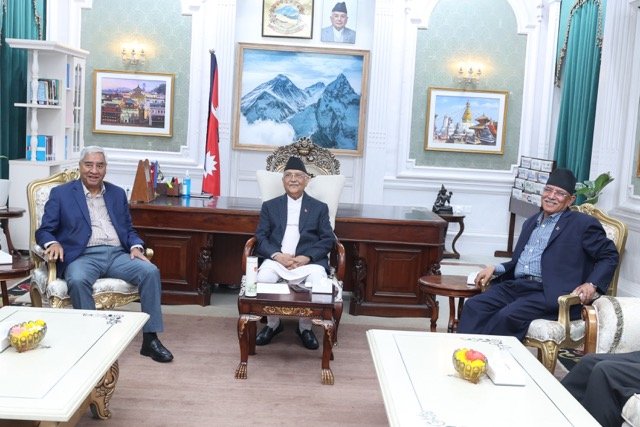 प्रधानमन्त्री तथा मन्त्रिपरिषद्को कार्यालय, सिंहदरबारमा भएको छलफलमा प्रधानमन्त्री एवं नेपाल कम्युनिष्ट पार्टी (एमाले) का अध्यक्ष ओली, नेपाली कांग्रेसका सभापति एवं पूर्वप्रधानमन्त्री शेरबहादुर देउवा, नेकपा (माओवादी केन्द्र) का अध्यक्ष एवं पूर्वप्रधानमन्त्री पुष्पकमल दाहाल ‘प्रचण्ड’, गृहमन्त्री रमेश लेखकलगायत सहभागी हुनुहुन्छ ।