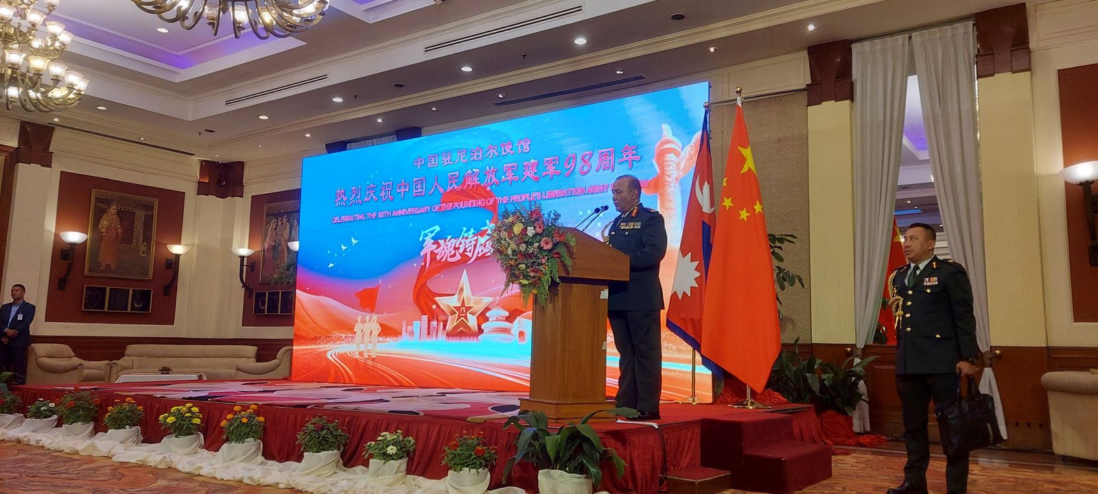 जनमुक्ति सेना स्थापनाको ९८औँ वार्षिकोत्सवका अवसरमा आज यहाँस्थित चिनियाँ दूतावासका सैनिक सहचारी ल्यु चङजङले आयोजना गर्नुभएको स्वागत समारोहमा उहाँले कोभिड महामारी र भूकम्पपछिको पुनर्निर्माणमा जनमुक्ति सेनाले गरेको सहयोग नेपाली सेनाले सदैव सम्झने बताउनुभयो । विपद् व्यवस्थापन र उद्धारमा जनमुक्ति सेनाका माध्यमबाट चीन सरकारले गरेको सहयोगप्रति आभार व्यक्त गर्दै प्रधानसेनापति सिग्देलले जनमुक्ति सेना र नेपाली सेनाबीच संयुक्त सैन्यअभ्यासका साथै अन्य पारस्परिक हित र चासोका साझा विषयमा सधैँ सहकार्य भइरहेको बताउनुभयो ।