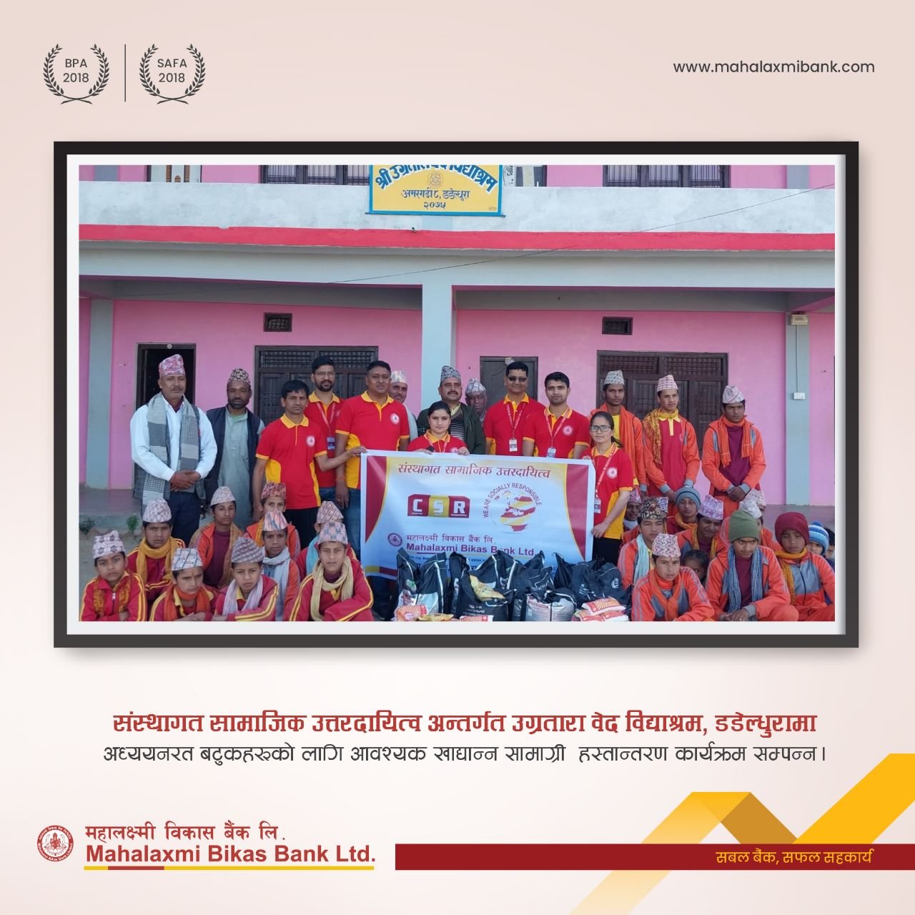 उल्लेखित कार्यक्रम सँगसगै बैकको डडेलधुरा शाखाद्वारा अमरगढी नगरपालिका वडा नं ८ मा अवस्थित उग्रतारा वेद विद्याश्रमका लागि आवश्यक खाद्यान्न हस्तान्तरण गरिएको छ । विद्याश्रममा अध्ययनरत ३० बटुकहरुको दैनिकआधारभुत आवश्यकता पुरा गर्न सहजता मिलोस भन्ने उद्देश्यले बैंकले विद्याश्रमलाई उक्त सहयोग प्रदान गरेको हो । सुदुर पश्चिमप्रदेशका नायव प्रदेश प्रबन्धकतथा डडेलधुर शाखाका प्रमुख चेत पाण्डेले उग्रतारा वेद विद्याश्रमका प्राचार्य प्रेमराज भट्टलाई सामाग्री हस्तान्तरण गर्नुभएको थियो ।